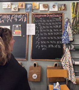Inside the shop, a chalkboard behind the register caught my eye: Classroom Donations, with grade levels and tally marks. A sign beside it read: Ask me about this program! $10 = 1 free book for a child.